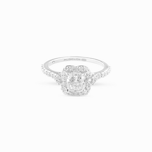 Anillo de Compromiso en oro blanco 18K modelo solitario con brillante cushion 0.90 carats en total y brillantes laterales con Gia y brillante interno.