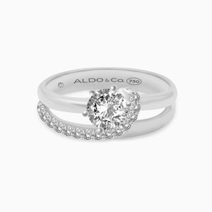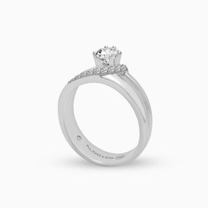 Anillo de Compromiso en oro blanco de 18K solitario modelo celestial con brillante central de 0.23 carats en total con lazo de 15 brillantes de 0.11 carats en total.