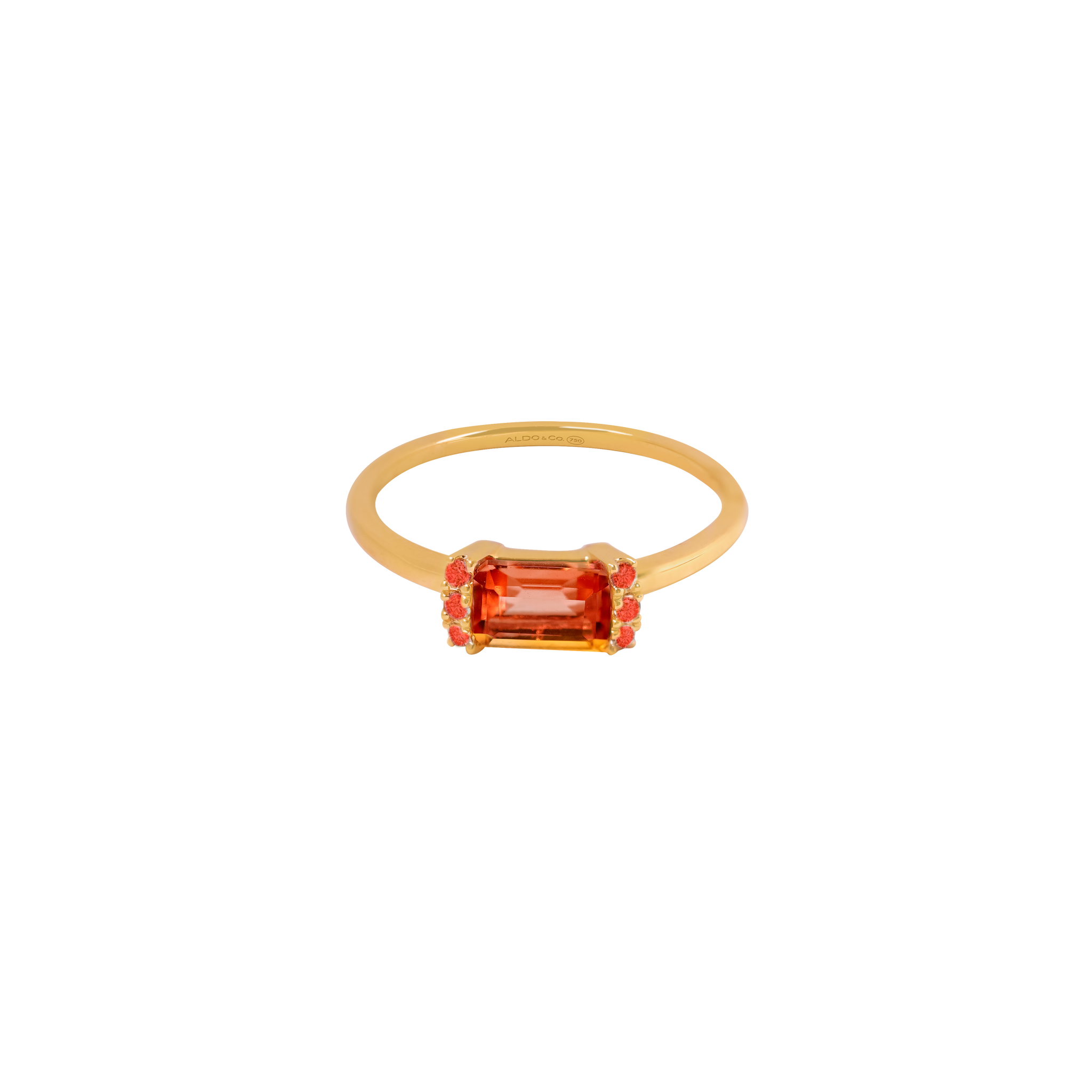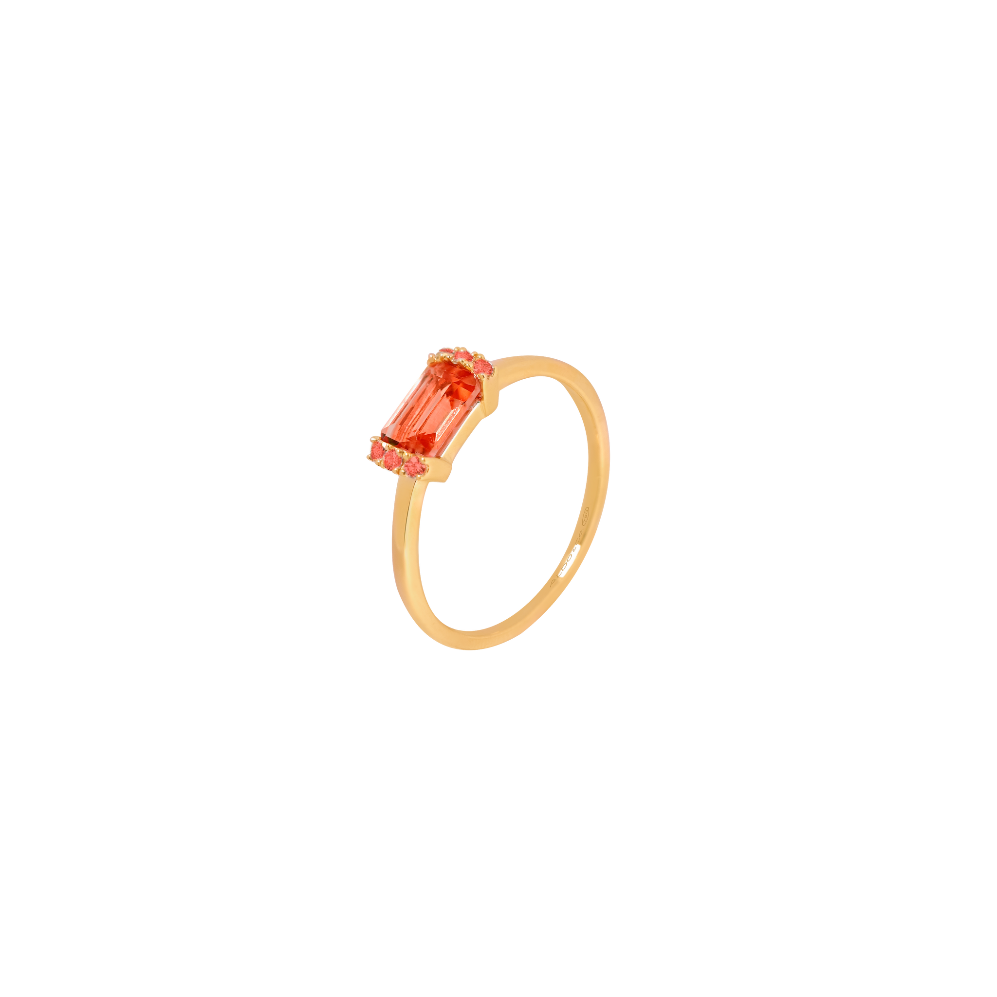 Anillo oro amarillo de 18K con granate corte esmeralda 0.76 carats en total y granate redondo 0.07 carats en total.