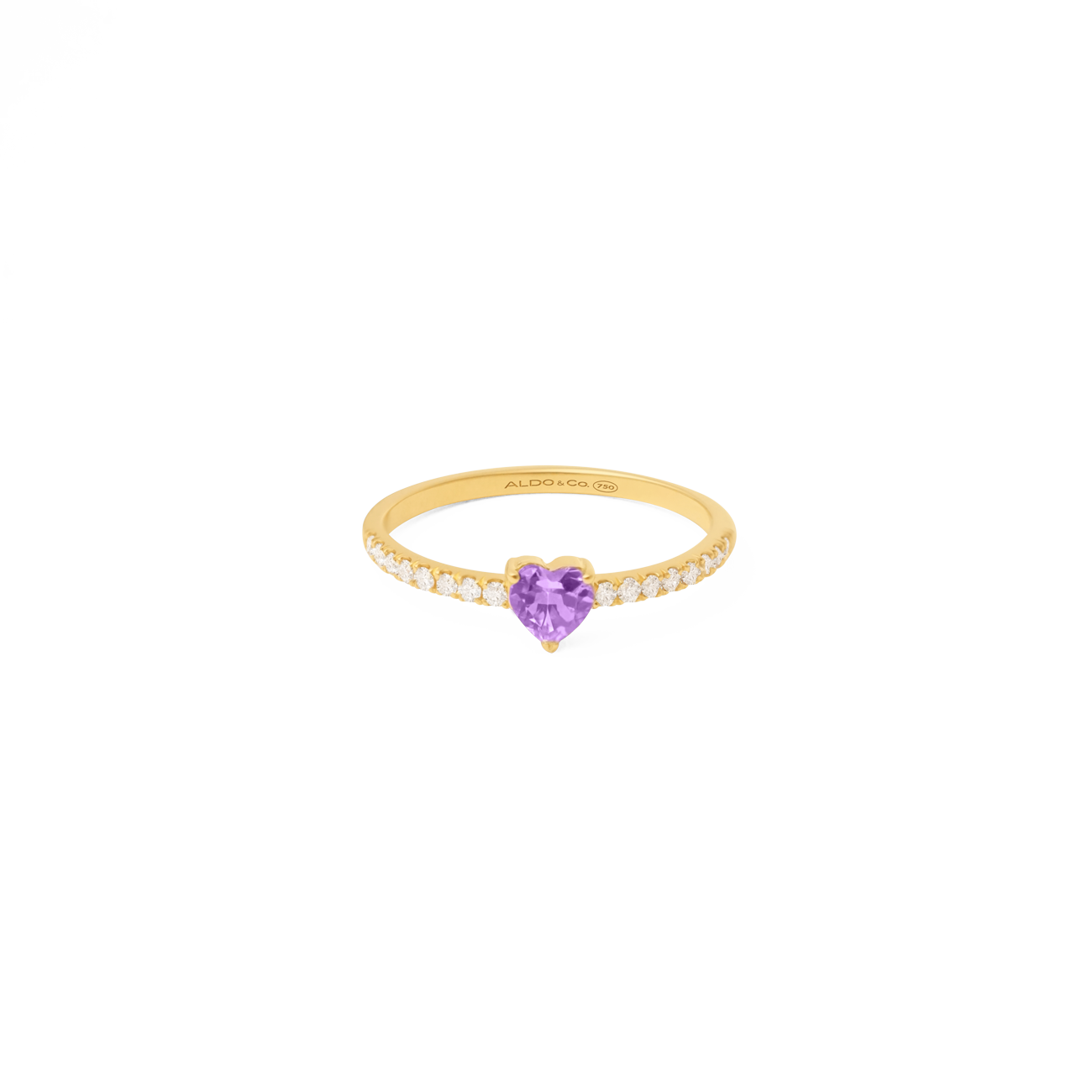 Anillo corazónoro amarillo de 18K bisel 3 uñas en V con amatista 0.22ct y brillos laterales 0.12ct