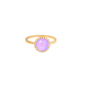 Anillo en oro amarillo de 18K cabuchón amatista 1.52 carats en total con halo de brillantes 0.06 carats en total.