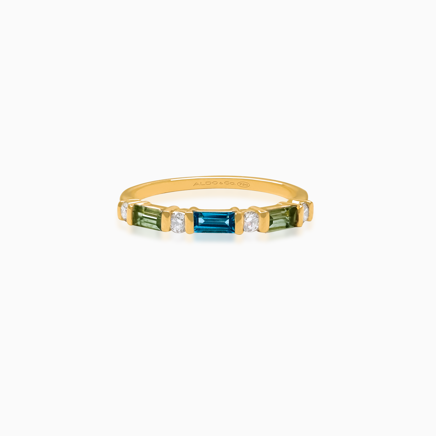 Anillo oro amarillo 18K medio rivière con con topacios azules en corte baguette 0.14 carats en total, zafiros verdes 0.30 carats en total y brillantes 0.12 carats en total.