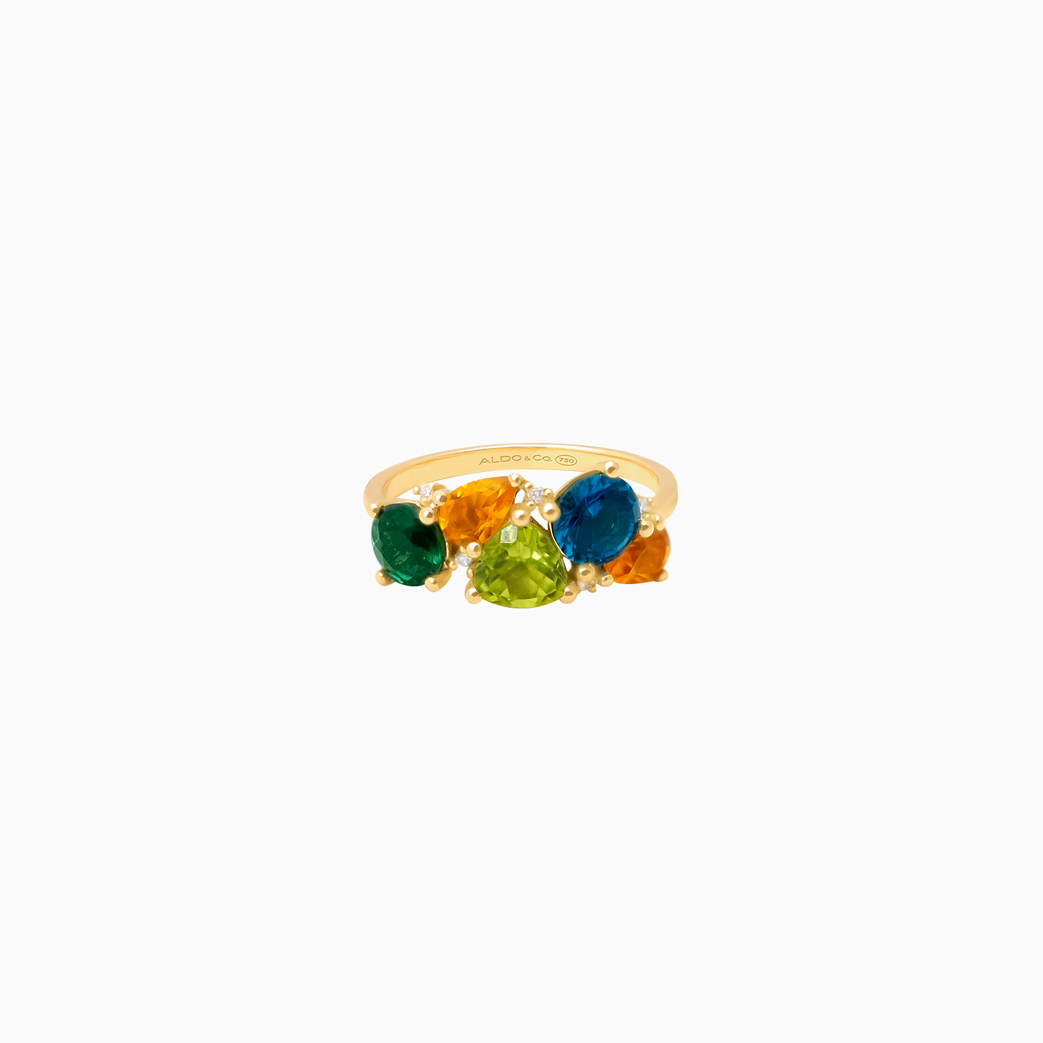 Anillo en oro amarillo de 18K con topacio 0.65 CT, citrino 0.36 CT, turmalina verde 0.42 CT, peridoto 0.51 CT y brillantes