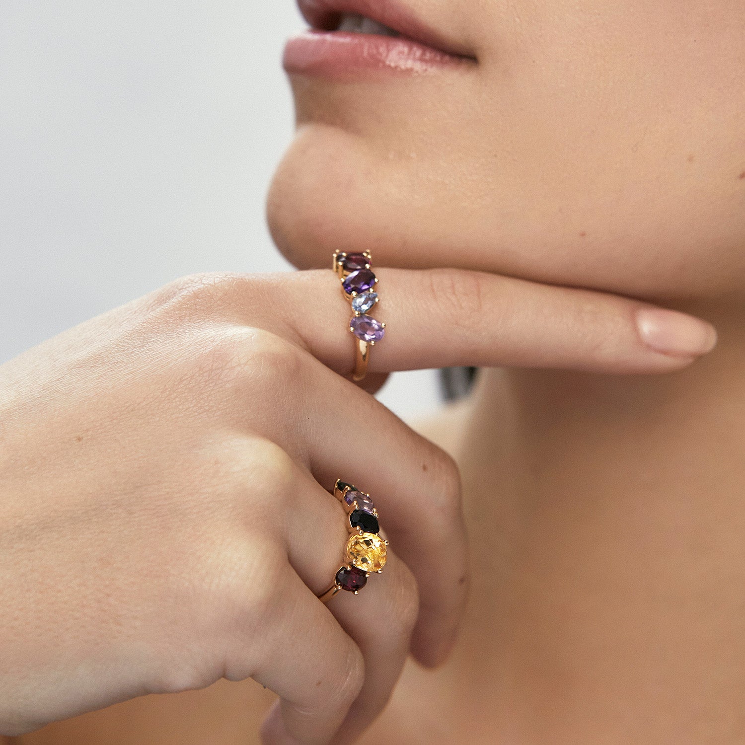 Anillo en oro amarillo de 18K piedras de colores en corte oval, iolita de 0.37 CT, rodolita de 0.61 CT, citrino de 1.20 CT, amatista de 0.45 CT y turmalina de 0.23 CT.