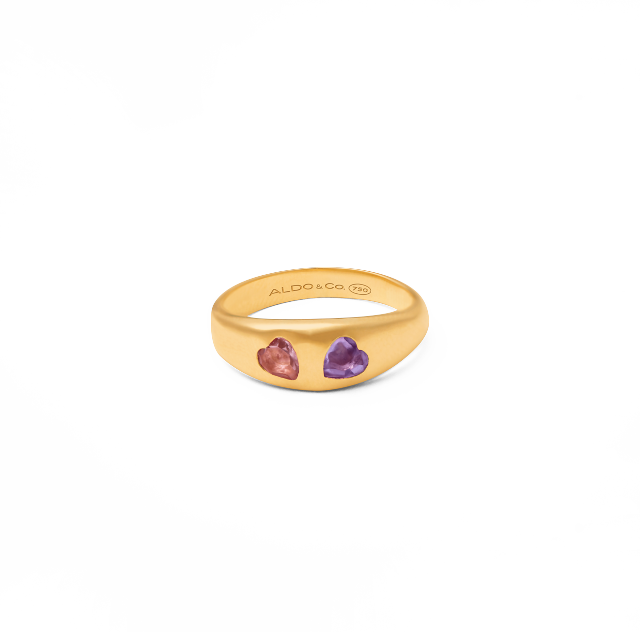 Anillo en oro amarillo de 18K orgánico delgado con 2 corazones turmalina rosada 0.23 ct. y amatista 0.22 ct.