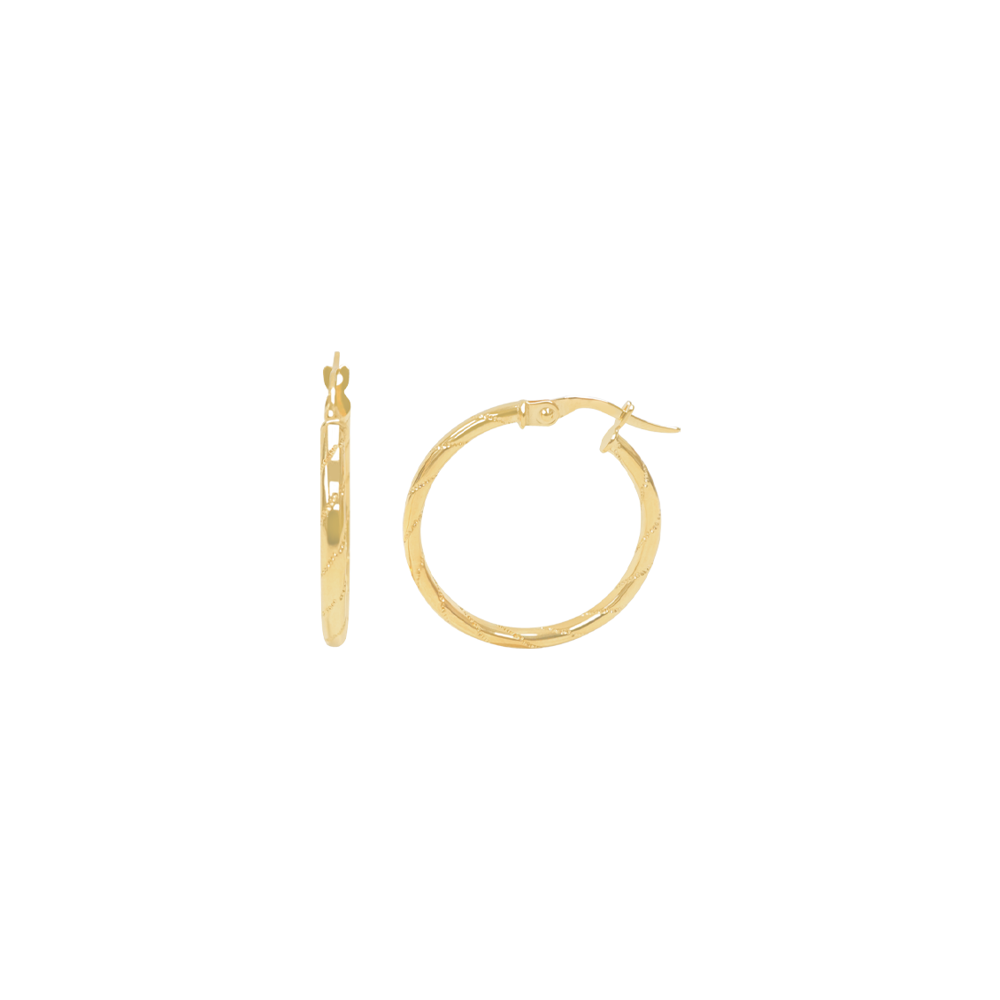 Aretes oro amarillo 18K argolla grande con línea entrelazada martillada.