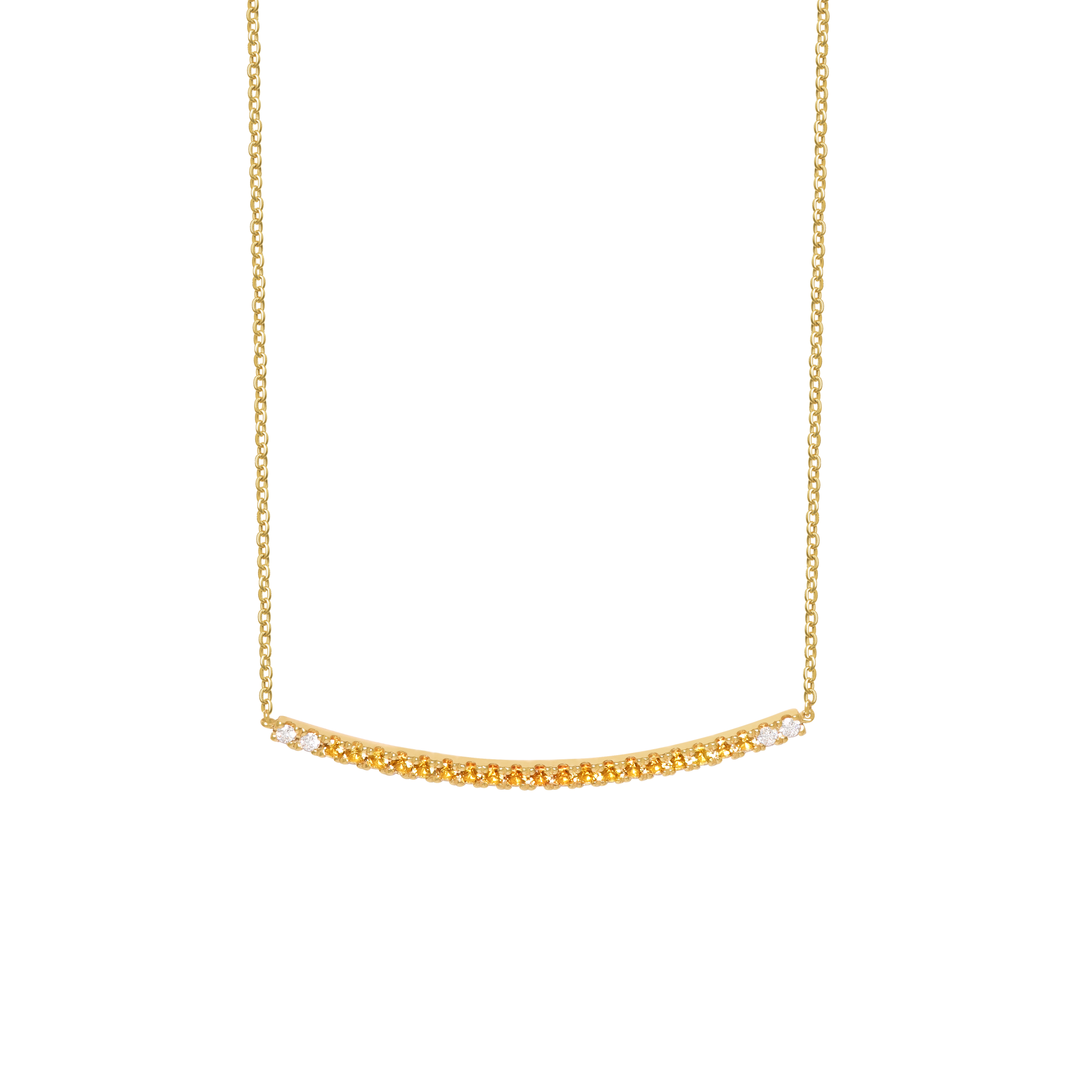 Collar en oro amarillo de 18K barrita curvo con zafiro amarillo 0.40 carats en total, colores en degrade y brillantes 0.07 carats en total.
