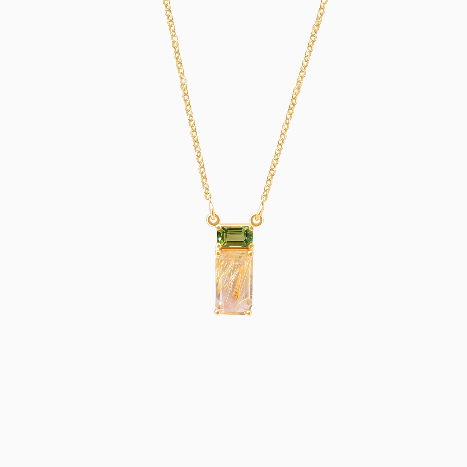 Collar oro amarillo 18K complices con cuarzo rutilado corte esmeralda 1.20 CT y zafiro verde corte esmeralda 0.35 CT