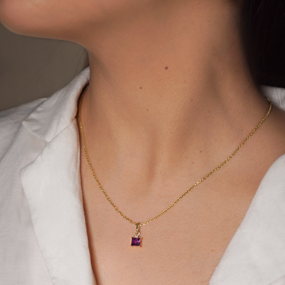 Dije Zodiacal Acuario en oro amarillo de 18K con amatista carre oscuro de 0.47 carats en total y brillante de 0.01 carats