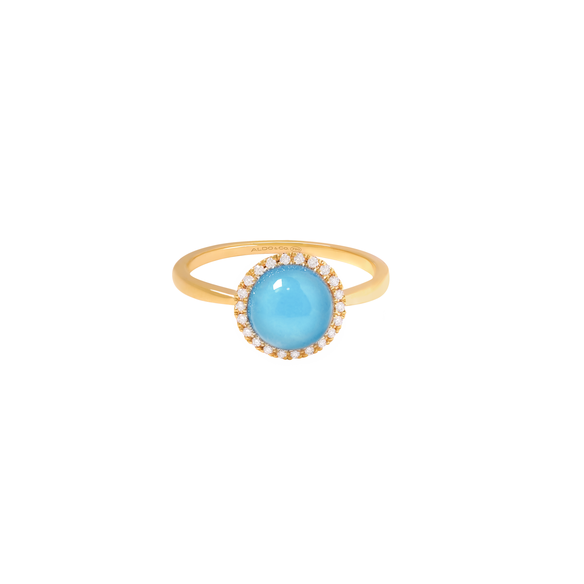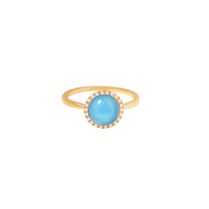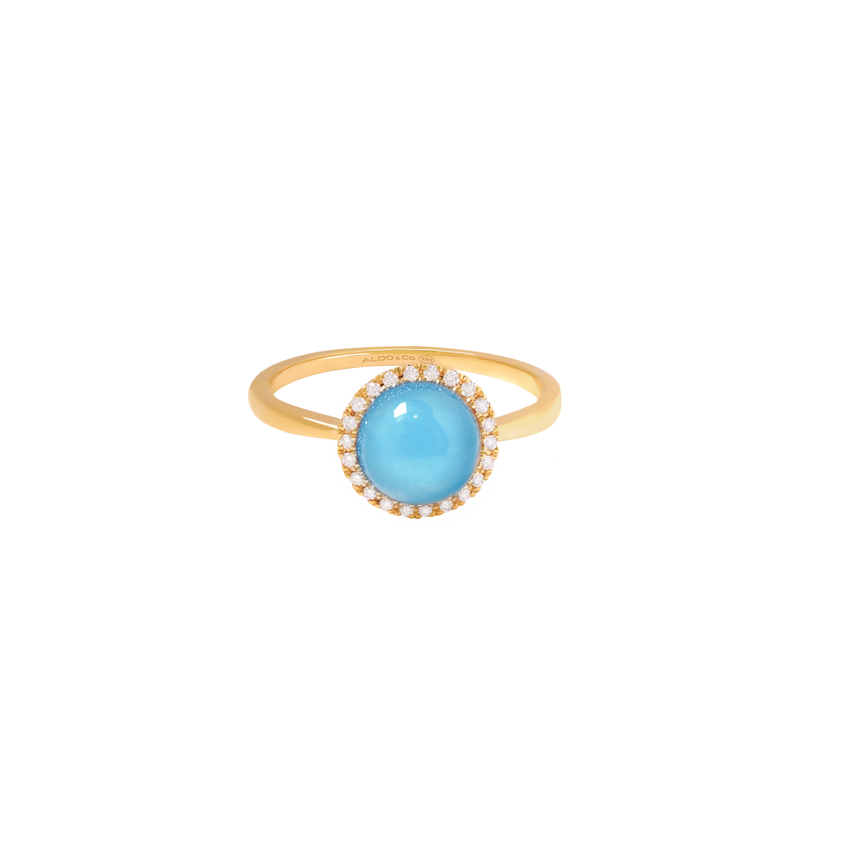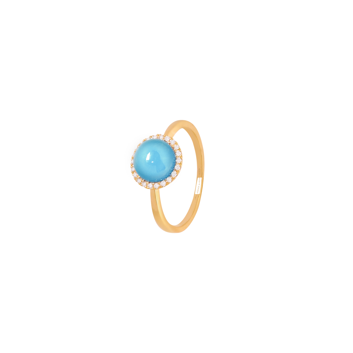 Anillo en oro amarillo de 18K cabuchón topacio azul 2.09 carats en total con halo de brillantes 0.06 carats en total.