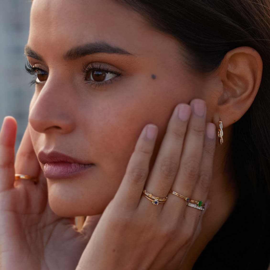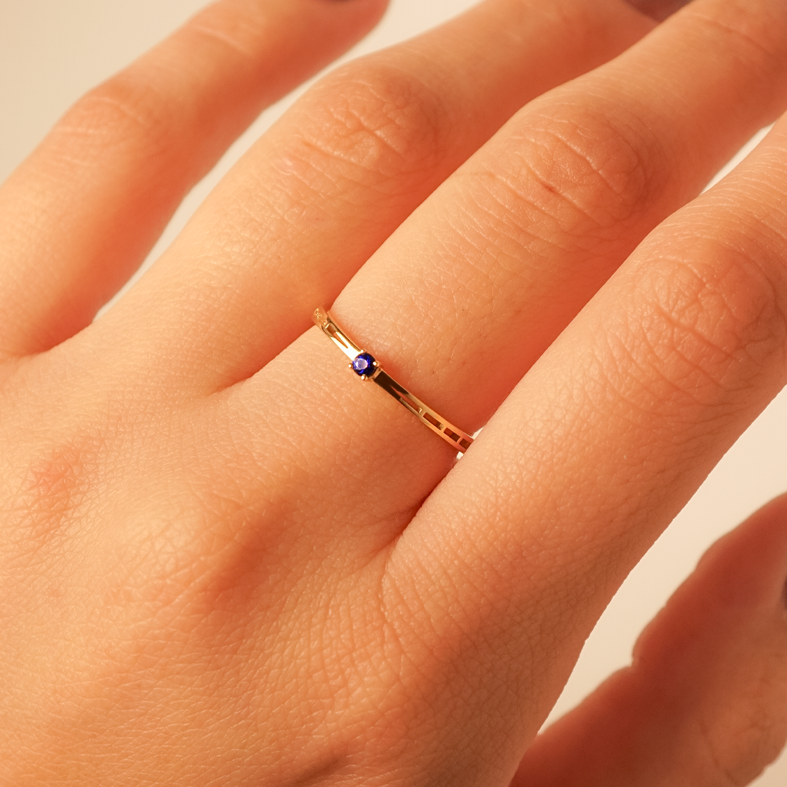 Anillo Downtown Glow en oro amarillo de 18K con zafiro de 0.04 carats en total, aro con bajo relieve y calados rectangulares