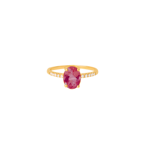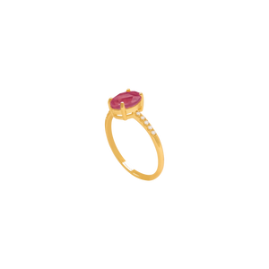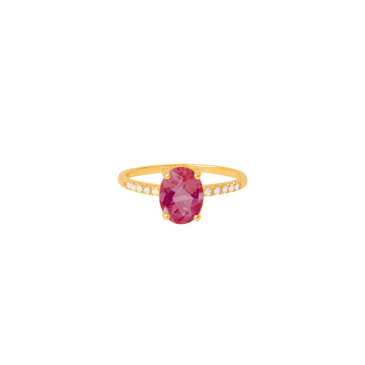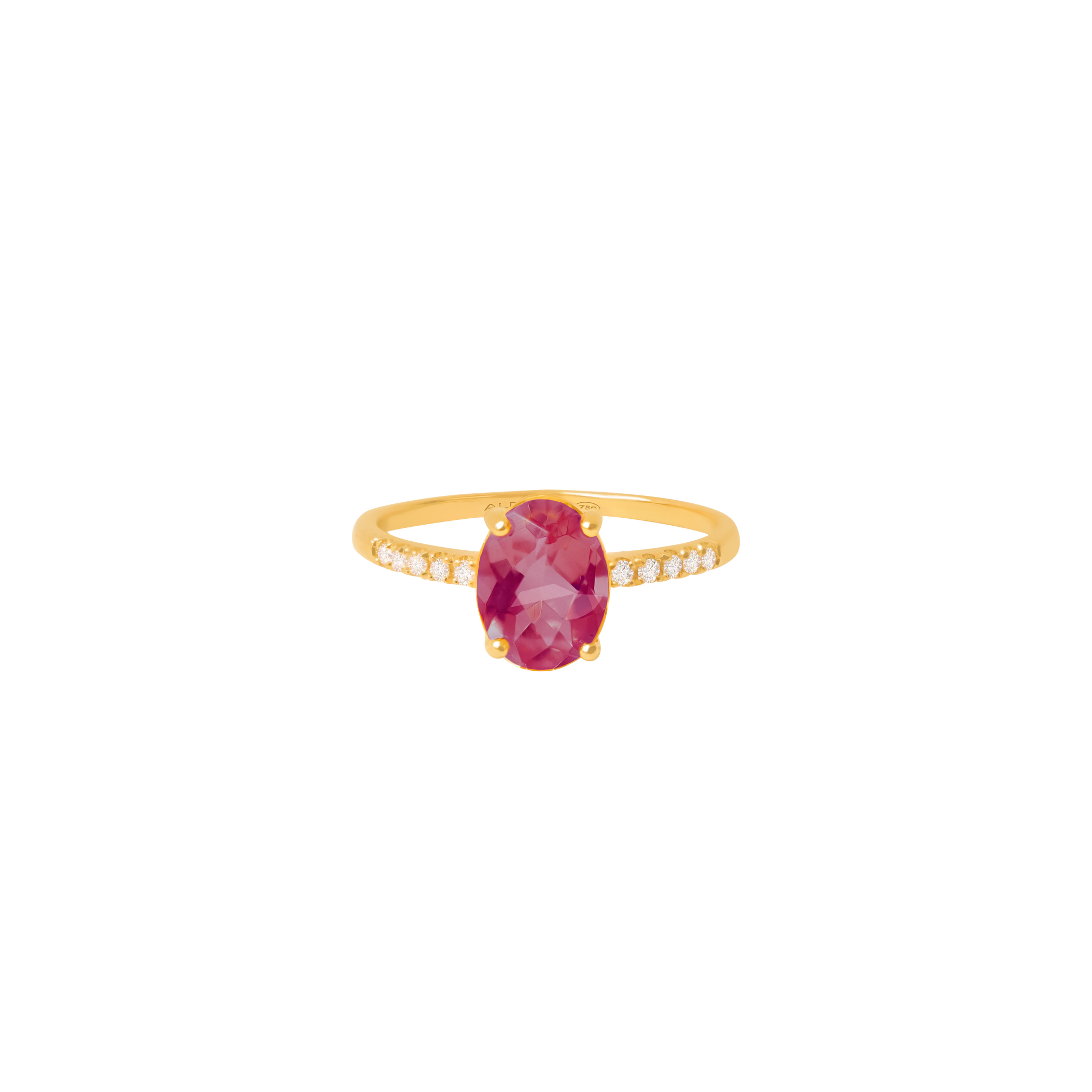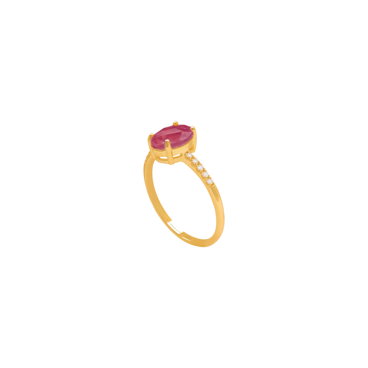 Anillo oro amarillo de 18K con rodolita oval 0.93 carats en total con brillantes laterales 0.075 carats en total.