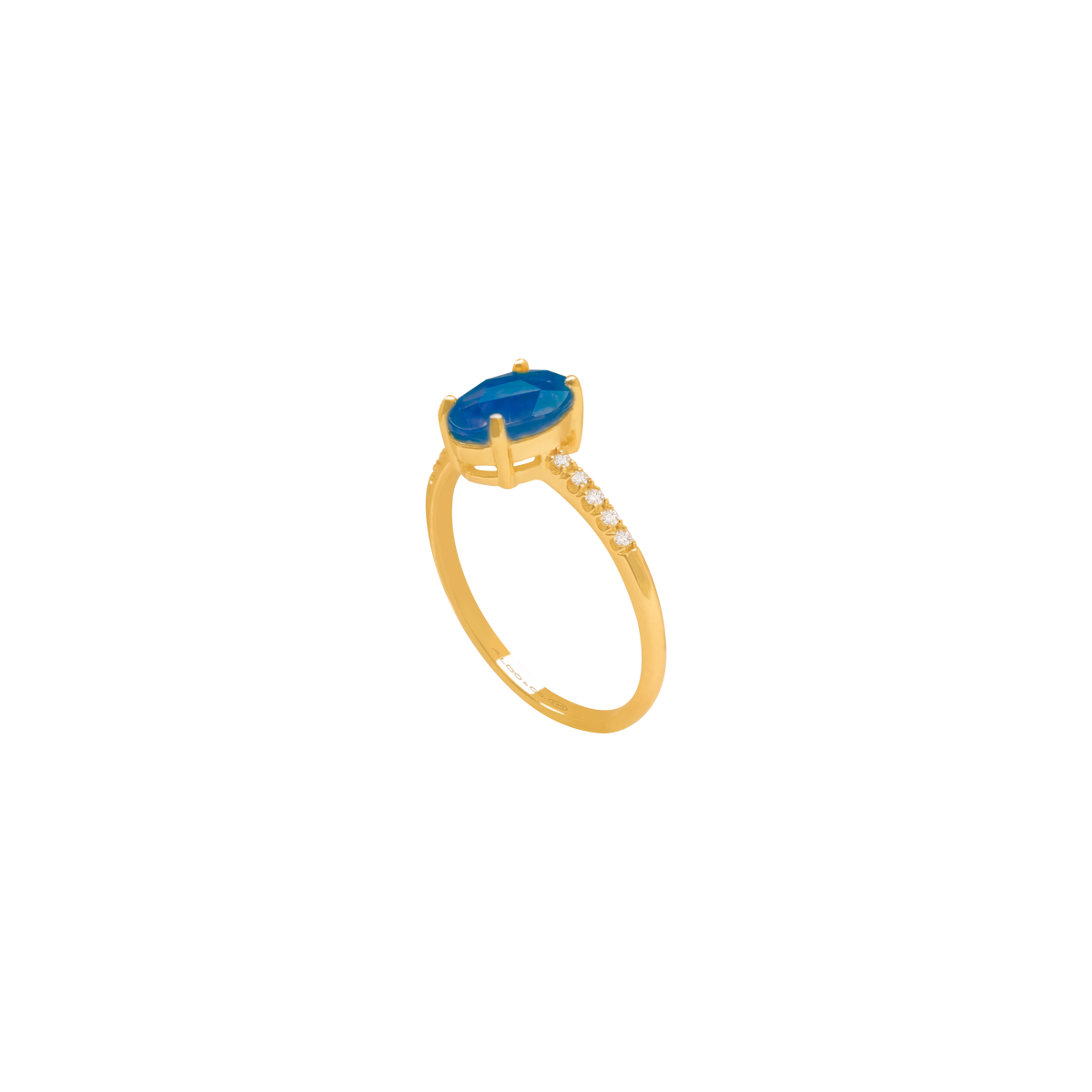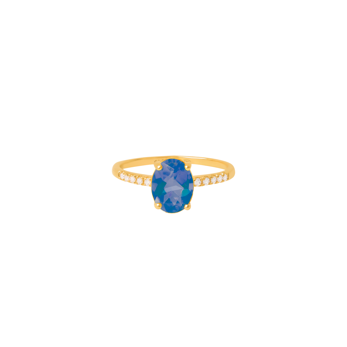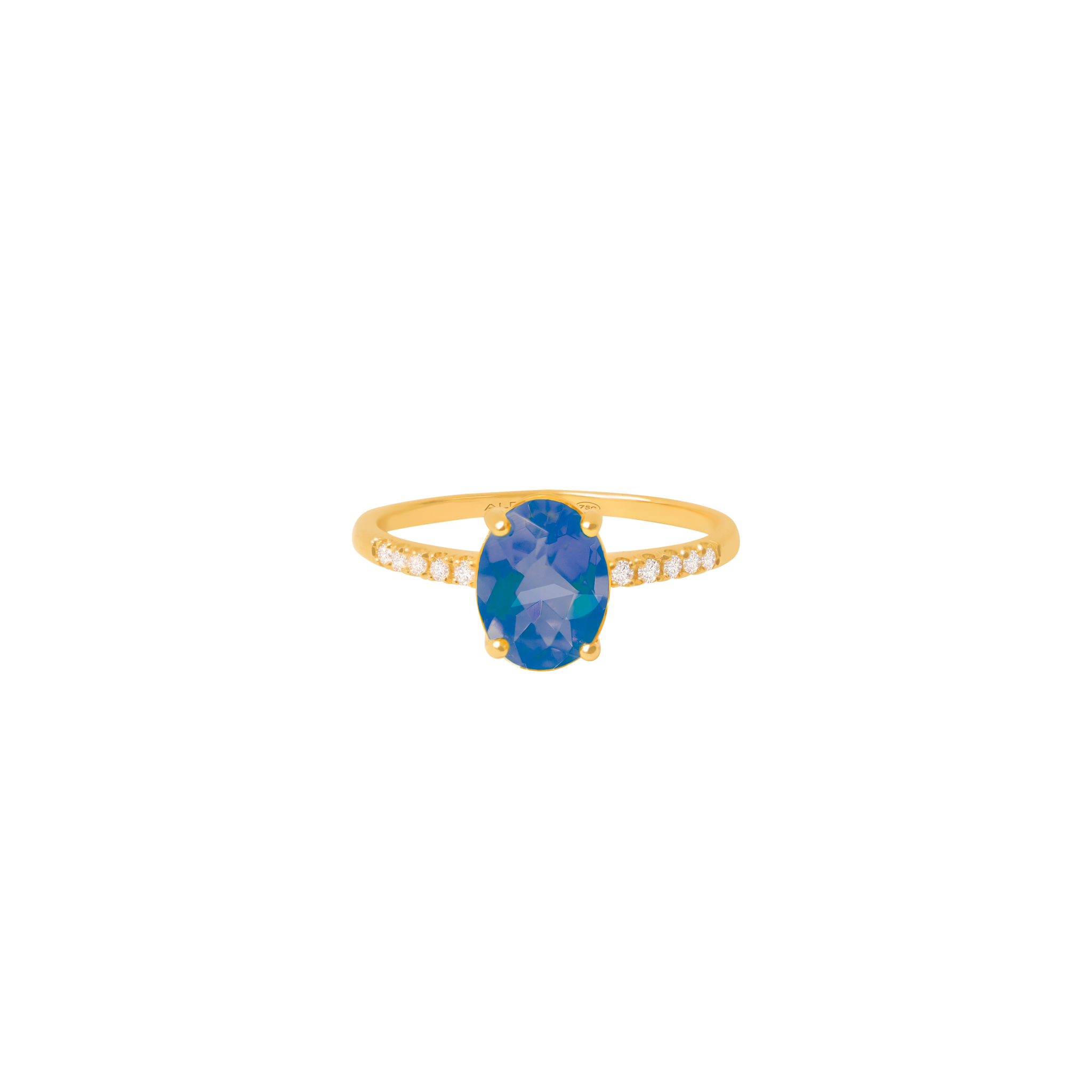 Anillo oro amarillo de 18K con topacio azul London blue oval 1.03 carats en total con brillantes laterales 0.075 carats en total.