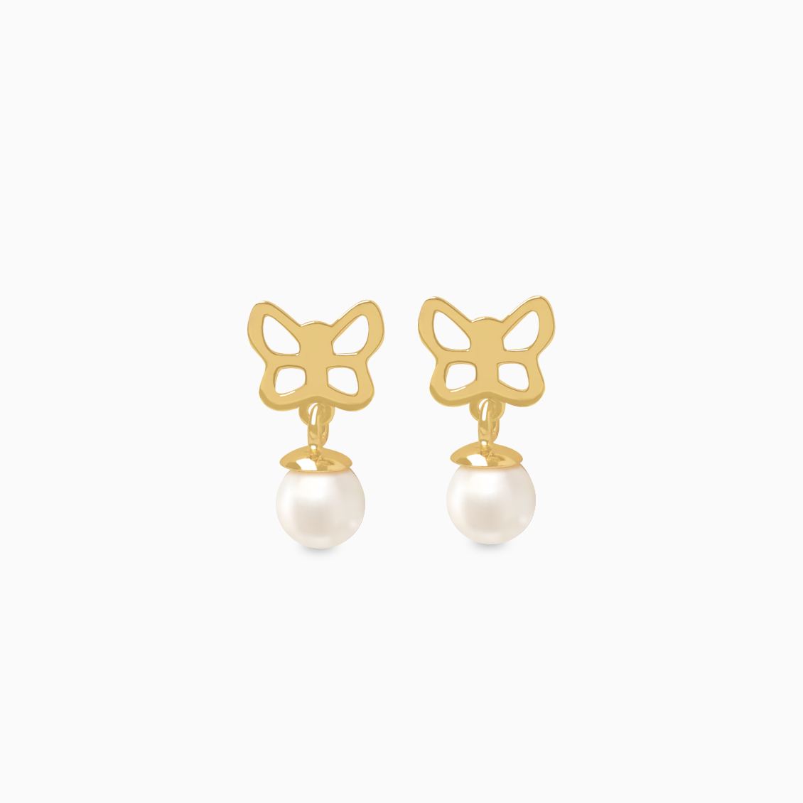 Aretes en oro amarillo de 18K mariposa calada con perla colgante