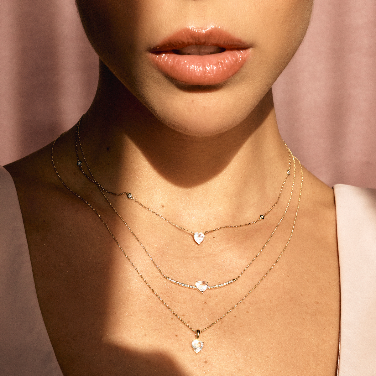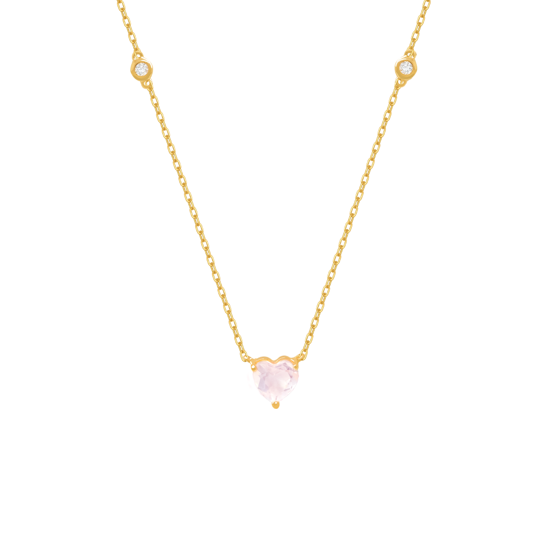Collar en oro amarillo de 18K con cuarzo rosado corazón 0.73 carats en total y brillantes 0.08 carats en total con cadena rolito con placa reguladora, con 2 uñas redondas y 1 uña corazón