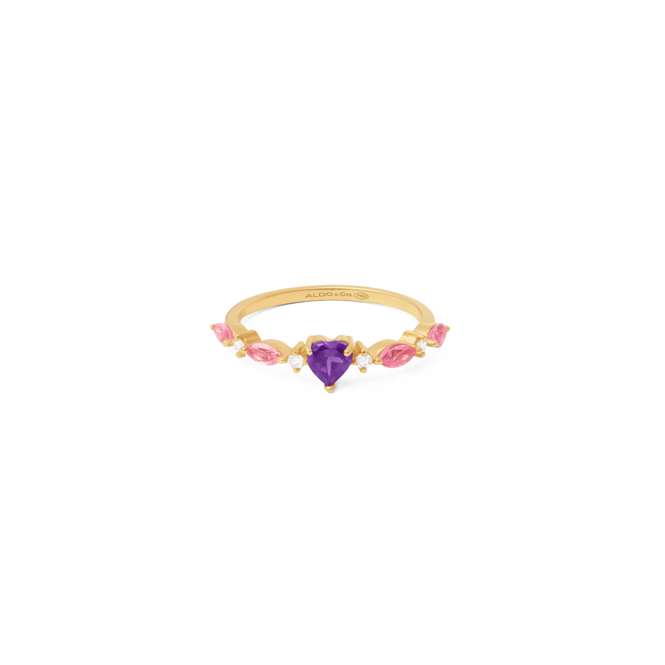 Anillo oro amarillo de 18k corazón con amatista 0.22ct y zafiros rosados laterales 0.40ct y brillo 0.06ct