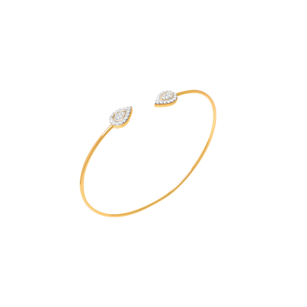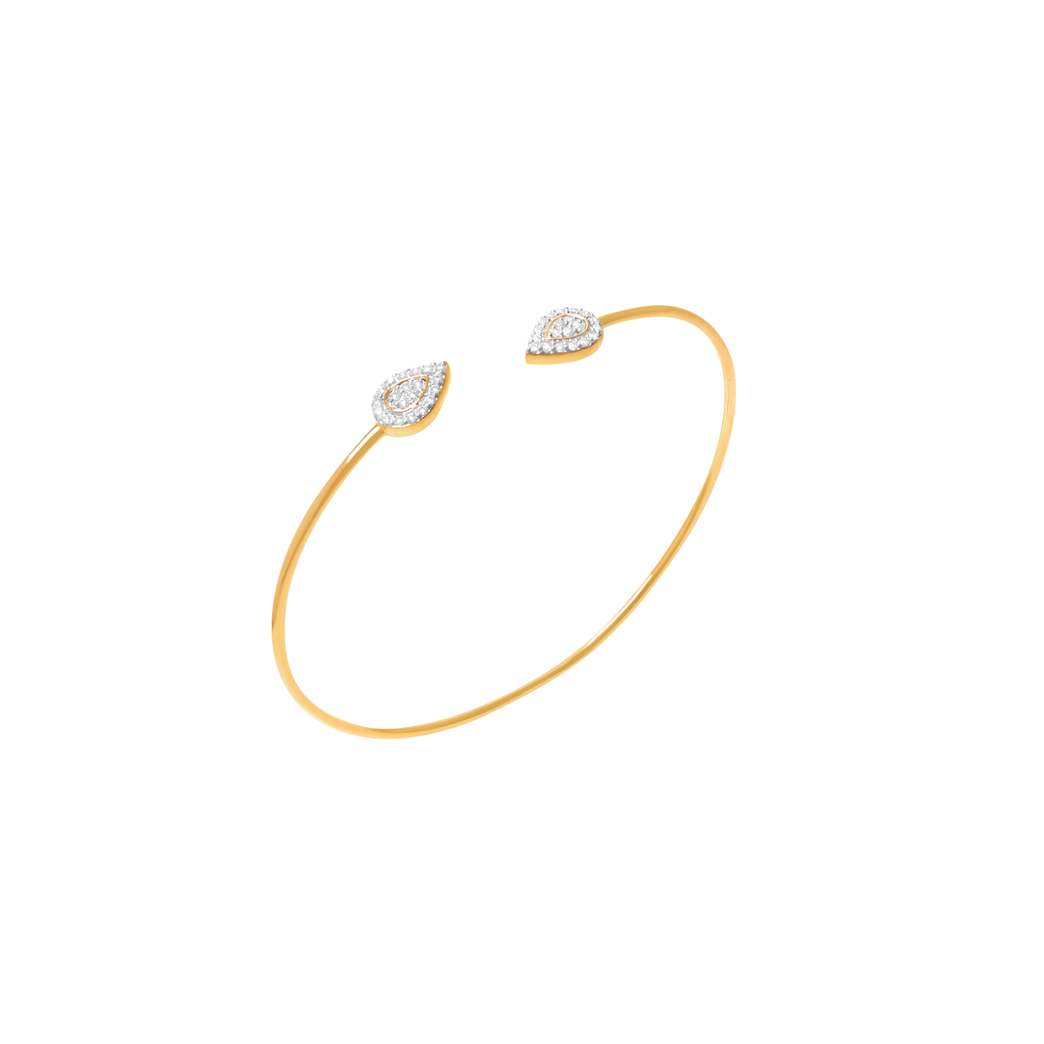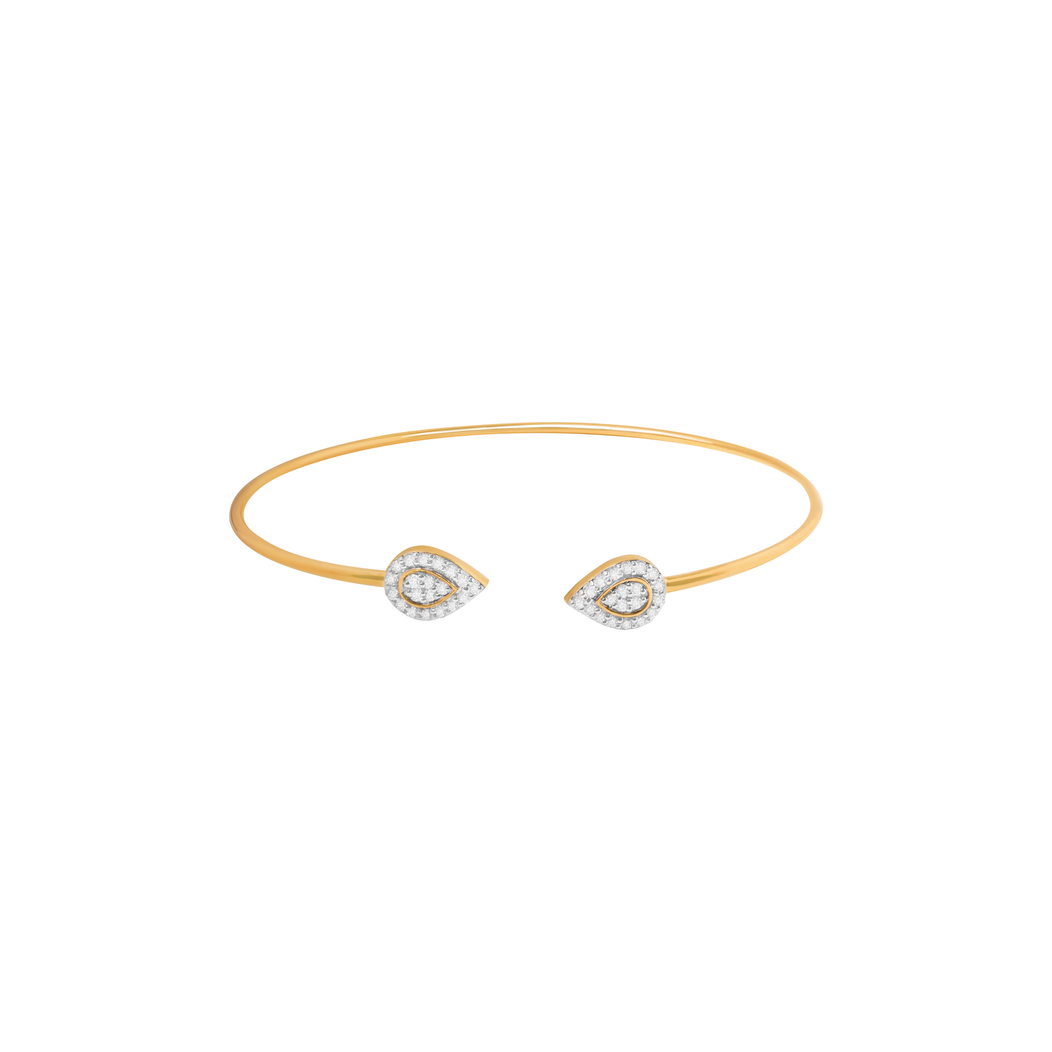 Pulsera en oro amarillo de 18K tubular semiabierta con terminaciones gotas full brillantes 0.24 carats en total.
