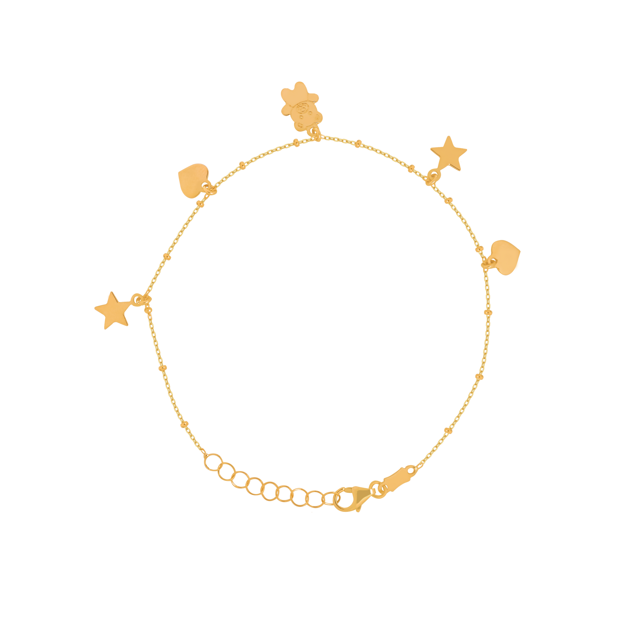 Pulsera oro amarillo de 18K con dijes estrella, corazón, oso y cadena rolo con bolitas.